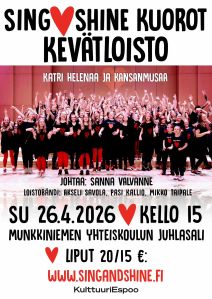 ☀️ Tervetuloa Kevätloistoon su 26.4.2026, klo 15-16.30! Koko perheen konsertti täyttää Munkkiniemen yhteiskoulun juhlasalin laulun riemulla ja ilmaisun voimalla – kevättä ja Katri Helenaa juhlistaen.