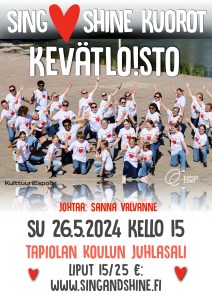 💚 Tervetuloa Kevätloistoon su 26.5.2024, klo 15 Tapiolan koulun ja lukion juhlasaliin! Koko perheen konsertti Tapiolan vehreässä sydämessä täyttyy laulun riemulla ja ilmaisun voimalla kevättä juhlistaen. Sing & Shine Kuoroille ominainen puhutteleva ohjelmisto eri puolita maailmaa, jossa on sopivasti voimaa ja herkyyttä, uutta ja vanhaa, poppia ja perinteitä, saa niin esiintyjät kuin yleisönkin liikkumaan ja liikuttumaan.